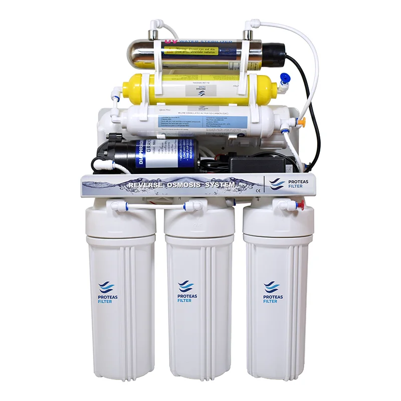 Реверзна осмоза со 7 фази со пумпа и UV ламба, резервоар и славина Системот вклучува: 3 претфилтри: полипропиленски филтер 10″ – 1μm, гранулиран активен јаглен 10″, солиден активен јаглен 10″ – 5μm Мембрана 50 GPD In-line филтер со гранулиран активен јаглен (за подобрување на вкусот и мирисот] In-line минерален филтер (за збогатување на водата со калциум и магнезиум] Финален UV стерилизатор Главни функции: • Отстранува цврсти честички и талози (песок, рѓа, нечистотија, кал] • Отстранува 99% хлор, неговите деривати, органски супстанции и пестициди • Мембраната отстранува тешки метали и контаминанти (олово, бариум, хром, живо, натриум, кадмиум, флуор, нитрит, нитрат, селен] • UV ламбата ги елиминира микробите преку ултравиолетово зрачење • Пакетот вклучува сет филтри, клуч и сите додатоци за поврзување