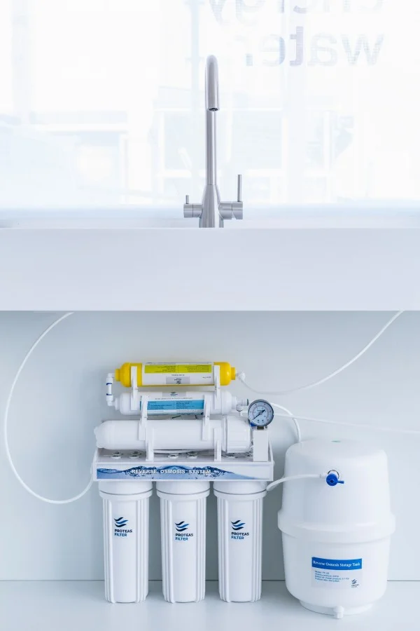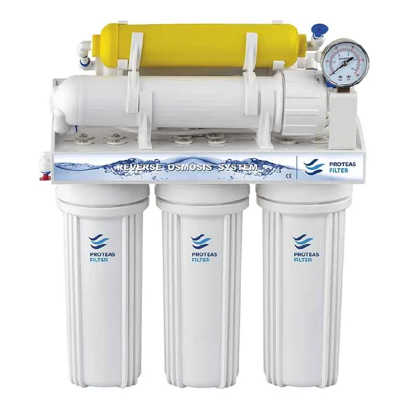 Реверзна осмоза со 6 фази, резервоар и славина. Системот вклучува: 3 претфилтри: полипропиленски филтер 10″ – 1μm, гранулиран активен јаглен 10″, солиден активен јаглен 10″ – 5μm Мембрана 50 GPD In-line филтер со гранулиран активен јаглен за подобрување на вкусот и мирисот на водата In-line минерален филтер, кој ја збогатува водата со елементи како калциум и магнезиум, неопходни за човечкиот организам Главни функции: Отстранува цврсти честички и талози (песок, рѓа, нечистотија, кал) 99% отстранување на хлор, неговите деривати, органски супстанции и пестициди 3 претфилтри за подобра заштита на мембраната, со цел продолжување на нејзиниот век на траење Мембраната отстранува контаминации кои можат да бидат присутни во водата, како што се олово, бариум, хром, живо, натриум, кадмиум, флуор, нитрит, нитрат и селен Идеален за поголема потрошувачка на вода (на пример, за еспресо машини, кафетерии) Пакетот вклучува: Сет филтри, клуч и сите потребни додатоци за поврзување. Овој систем обезбедува чиста, пречистена вода која е погодна за широк спектар на употреби, од домаќинства до комерцијални апликации!
